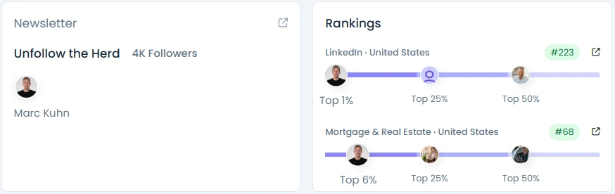 Marc has a strong following of over 58K followers with consistent, organic growth. His Influence Score is 4/5 (7,897 pts), placing him in the Top 1% of LinkedIn US and the Top 6% in Mortgage & Real Estate US rankings. He boasts an Outstanding Post Content score of 92 and a Natural Engagement quality of 75. His content is high-volume and consistent, with an active posting rhythm of around 43 posts per month, delivering regular value to his audience.