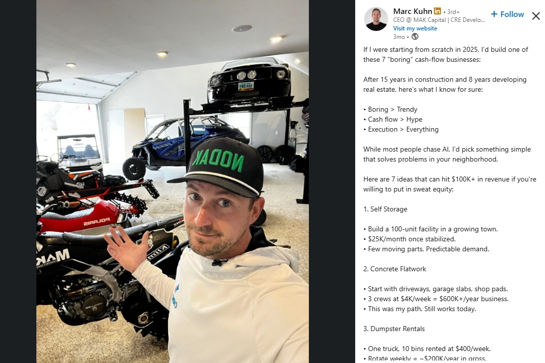 Marc Kuhn is the unexpected real estate and wealth-building guru dominating LinkedIn. He skipped the traditional path, college funds, and fancy degrees to build a massive portfolio, and he's not shy about showing you how he did it. His content is a powerful, no-fluff mix of personal story, hard data, and actionable financial advice. He's the authentic, blue-collar millionaire making high finance accessible to the aspiring entrepreneur.