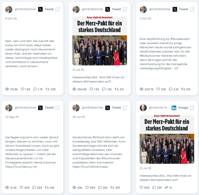 Germany debates, Marcel explains. As President of DIW Berlin and a leading public economist, he translates dense policy into everyday language that travels. His posts spark real discussion, not just likes, and his stance is consistent: growth with fairness, facts over noise.