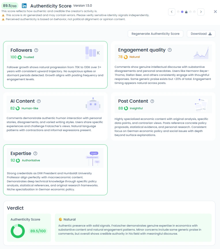 Favikon Score: 89.5/100. Comments read like real arguments with real people, not applause lines. Marcel uses natural language, links to sources, and jumps into threads to clarify, not to posture. He shares charts, policy text, and personal reflections from the front line of German economic debate. Authority without the ivory tower vibe.