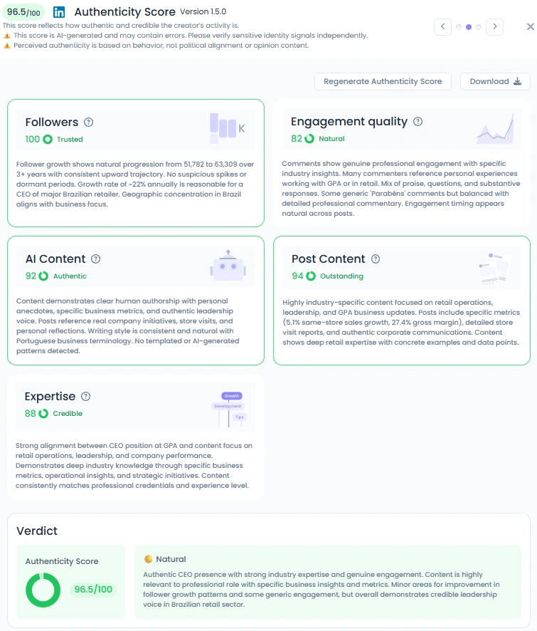 With a 96.5/100 Authenticity Score, Marcelo’s content feels human and transparent. His writing is direct, using business terminology naturally while keeping his tone approachable. He shares tangible results from GPA, personal leadership lessons, and reflections on his journey with sincerity. Even in corporate settings, his posts maintain a conversational tone that connects with readers, showing that influence built on humility lasts longer than trends.