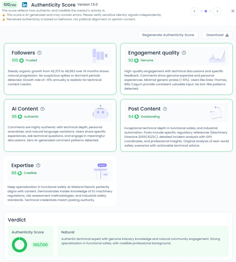 With a perfect Favikon Authenticity Score of 100/100, Marcus stands out for his genuine and engaging presence. His posts spark meaningful discussions among engineers and professionals who share personal insights and technical experiences. His audience includes peers who exchange feedback and debate safety concepts naturally. Marcus’s approachable tone and consistent interaction make his content feel like a community rather than a lecture.