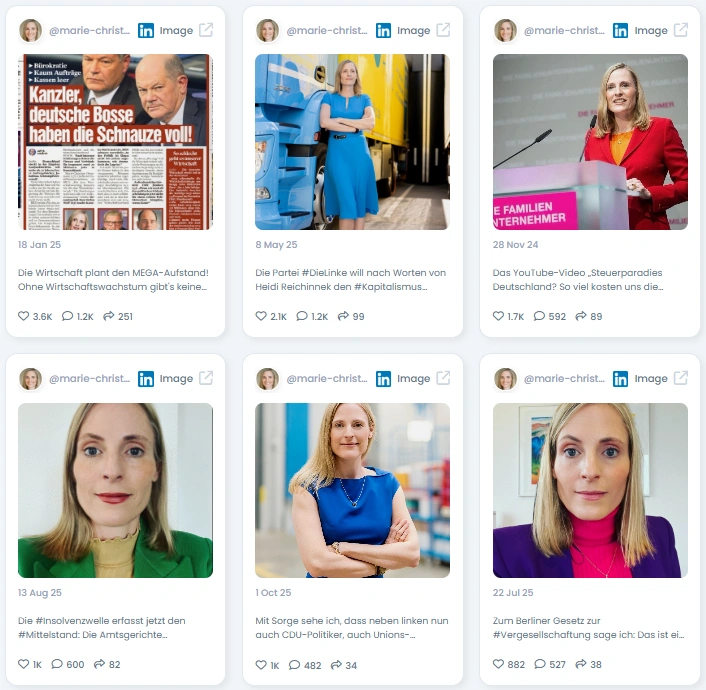 Marie-Christine is a business leader and longtime president within the Familienunternehmer network, representing thousands of family owned firms. She also runs her own company, giving her a grounded view of how regulation impacts real businesses. Her background combines entrepreneurship, economic policy work, media engagement, and advocacy at the highest levels. She has shaped national debates by commenting on tax policy, insolvency law, competitiveness, and labor market challenges. Her posts often use real data, relatable examples, and strong opinions to push for change. She positions herself as a voice for owners who want Germany to stay innovative and economically strong.