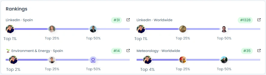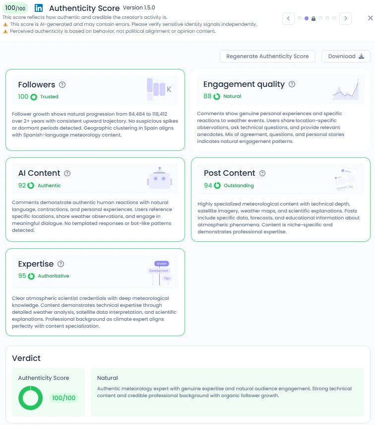 Mario’s influence continues to grow steadily. His follower base expanded from 84,484 to 118,412 over two years, driven by consistent engagement and audience trust. With an Influence Score of 8,268 points, he ranks among the Top 1% of LinkedIn creators in Spain and Top 4% of meteorologists worldwide. His Engagement Quality Score of 88/100 reflects active discussion and curiosity in the comments section. His rhythm of posts across LinkedIn, X, and Instagram keeps his audience informed, connected, and inspired.