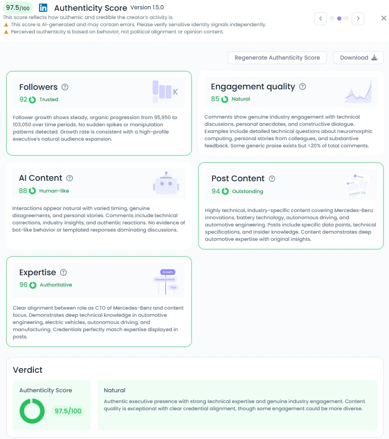 With an Favikon Authenticity Score of 97.5/100, Markus demonstrates how credibility and passion create lasting engagement. His interactions show genuine discussions about technology and sustainability, with thoughtful comments from industry peers and engineers. His followers appreciate his balanced tone, where achievements are shared with humility and technical depth. Markus’s content feels genuine because it is backed by real expertise and transparent communication.