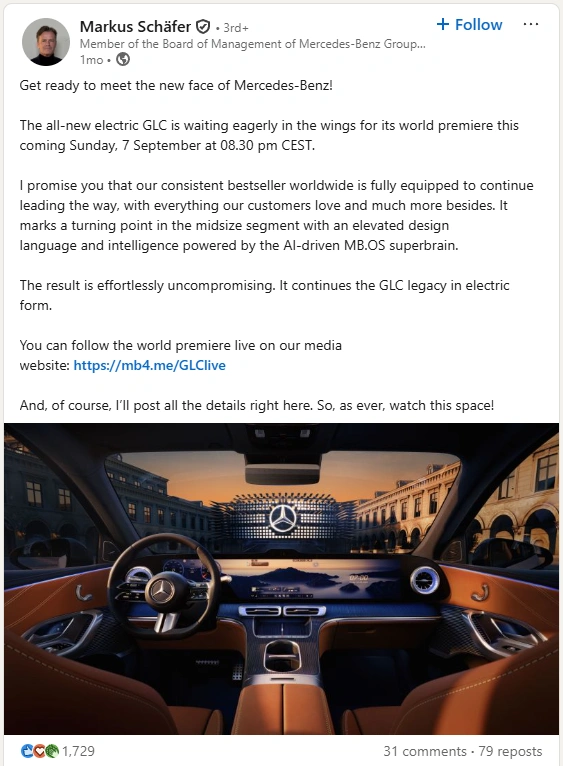 People listen to Markus because he makes complex innovation feel clear and exciting. His posts combine technical insight with storytelling, helping audiences understand the vision behind every new development. His communication style is structured, confident, and optimistic, appealing to both engineers and business leaders. He often highlights teamwork, celebrating the people and ideas that move Mercedes-Benz forward.