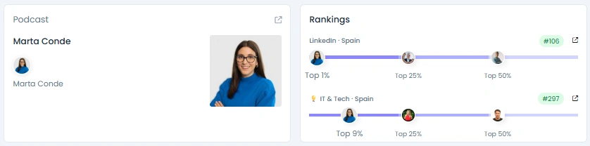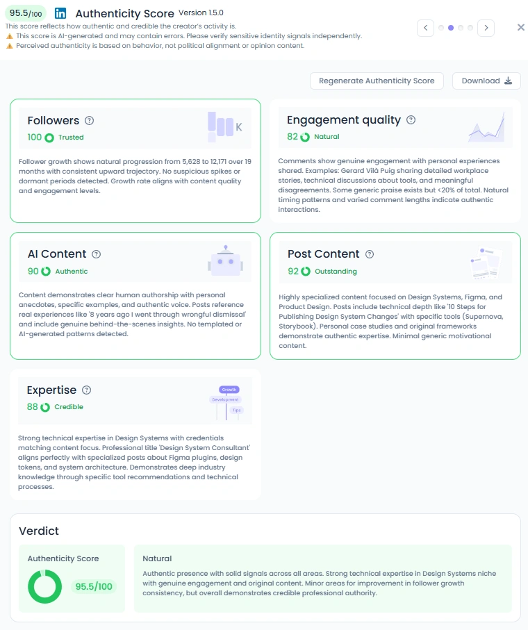 Her follower base grew from roughly 5,600 to 12,200 over 19 months, with organic spikes tied to high value posts. Her Influence Score is about 5,975 points, and she ranks in the Top 1% on LinkedIn Spain and strong inside IT & Tech. Engagement quality sits in the low 80s, while post content and AI authenticity both score around the 90 mark. In short, she combines steady growth with consistently useful output.