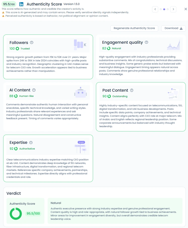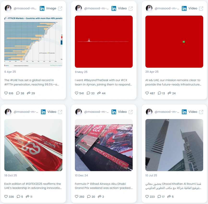 Masood’s Favikon Authenticity Score of 95.5/100 reflects his ability to connect with professionalism and sincerity. His posts are transparent and human, often combining technical milestones with genuine appreciation for his team and country. His tone remains consistent across languages, balancing Arabic and English to reach both regional and international audiences. His presence on LinkedIn feels purposeful and grounded, showing how authentic leadership drives trust in the digital era.