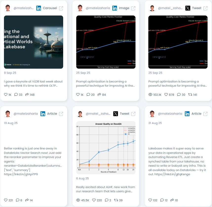 Matei’s circle includes Databricks leaders, Berkeley researchers, and founders across infra and AI. You’ll spot connections with Meta researchers, the open source community, Neon, and the broader data engineering world. Media, investors, and CTOs track his posts for early looks at what is next. The result is deep credibility across both academia and industry.