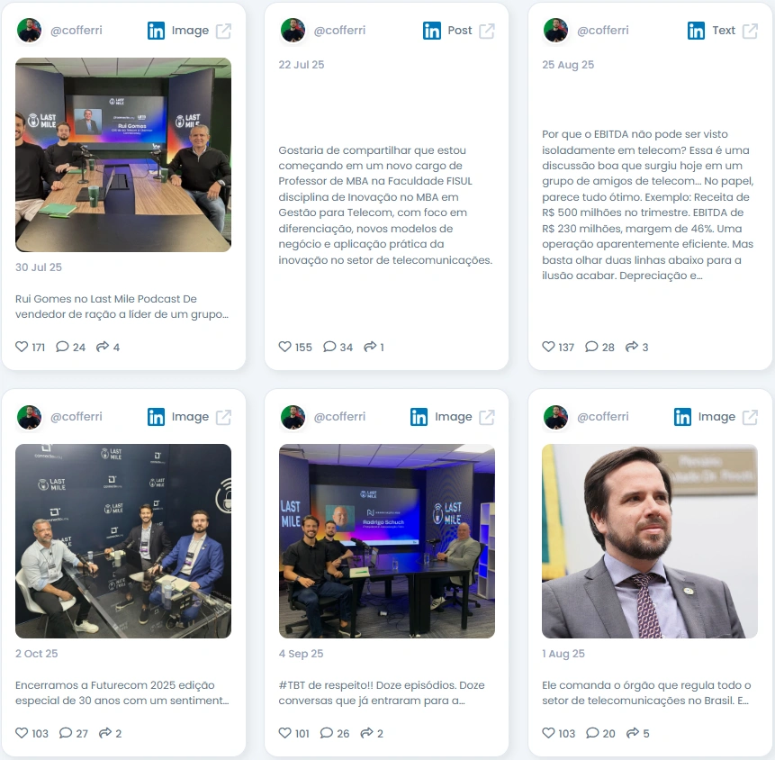 People follow Matheus because he brings clarity and perspective to the telecom world. His tone is confident yet approachable, always rooted in real experience. He shares data and insights but adds context and personal reflection, making each post valuable to both experts and newcomers. Whether analyzing telecom economics or celebrating industry milestones, his voice remains balanced, informative, and engaging.