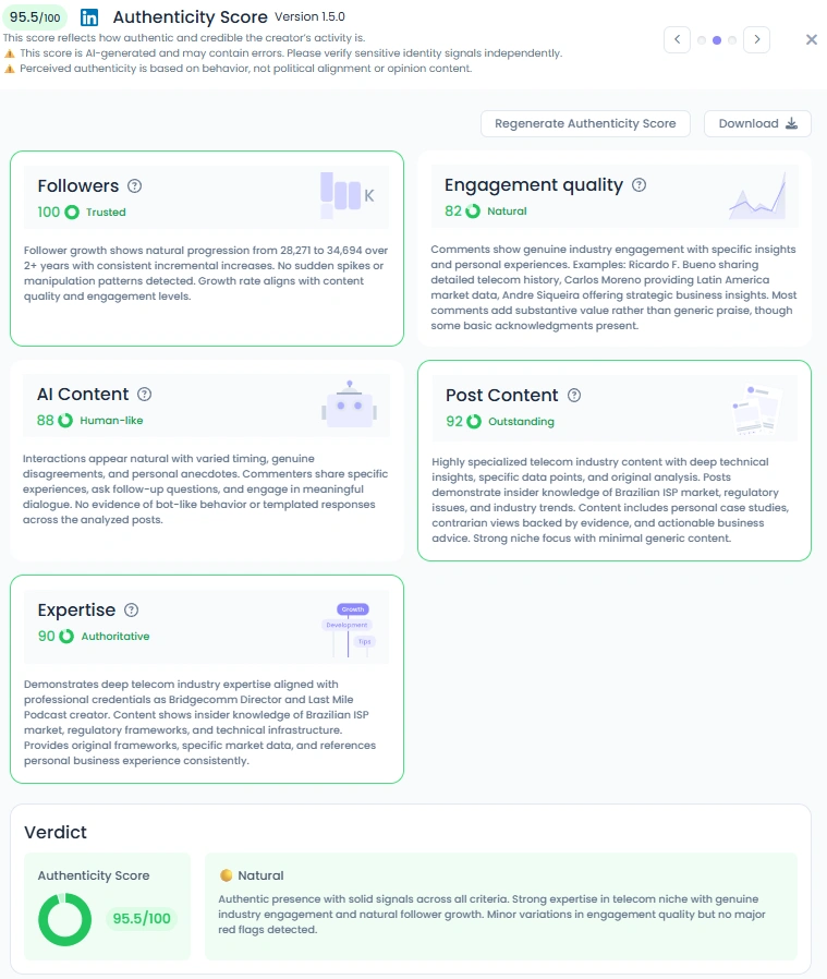 With a Favikon Authenticity Score of 95.5/100, Matheus stands out for his credibility and consistency. His follower growth is organic and steady, supported by meaningful conversations rather than vanity metrics. His comment sections show real dialogue, where professionals exchange experiences and perspectives. With a score of 90 in expertise and 88 in human-like interaction, Matheus keeps his content both authoritative and approachable.