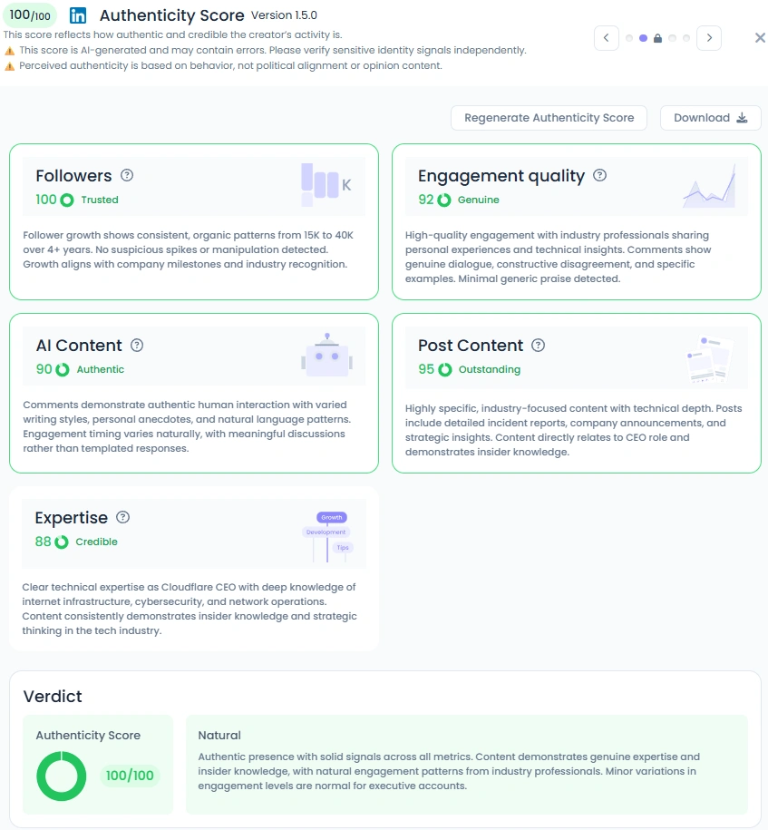 Matthew scores a perfect 100/100 Authenticity Score, which is rare even among top tech executives. His AI Content score of 90 shows that his posts are written with a personal voice and technical insight. His Post Content score of 95 confirms that every post carries real substance, whether it’s a product announcement, a company milestone or a technical report. Comments under his posts often include meaningful dialogue from developers, engineers and industry insiders. His Engagement Quality score of 92 reflects this real interaction. There’s very little fluff. Just clear thinking and professional conversation.