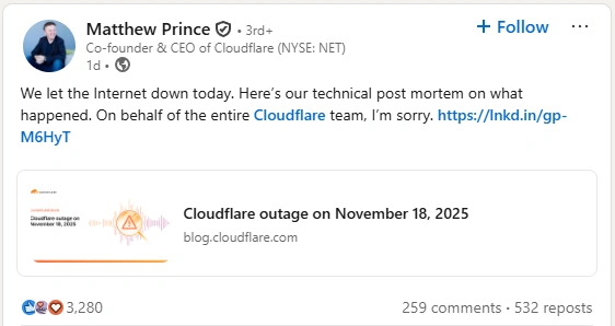 Matthew has mastered the art of saying complex things simply. His content is clear, direct and often surprisingly candid. When there’s a Cloudflare outage, he doesn’t hide it. He explains what happened and how they’ll fix it. When he sees a problem in the way AI is reshaping the web, he shares his view with context and optimism. He posts like a founder who knows his product, values his people and respects his audience. That kind of transparency earns attention and trust.