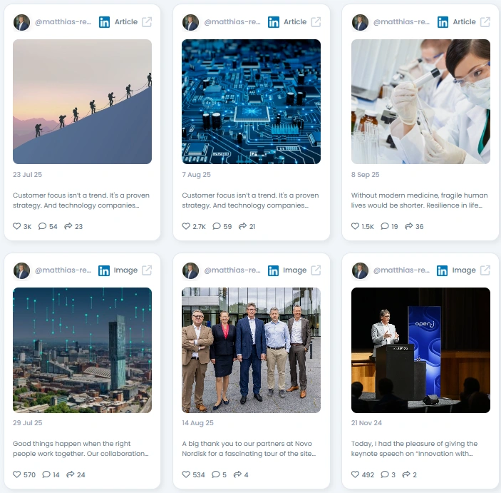 Matthias has grown his audience to more than 43,000 followers, with steady and organic progression over four years. His influence score sits at 5,791 points, placing him in the top tier of Germany’s LinkedIn executives. His engagement quality is strong, with consistent interaction from industry professionals and thought leaders. He posts regularly through both articles and images, keeping a steady rhythm that fuels discussion rather than noise.