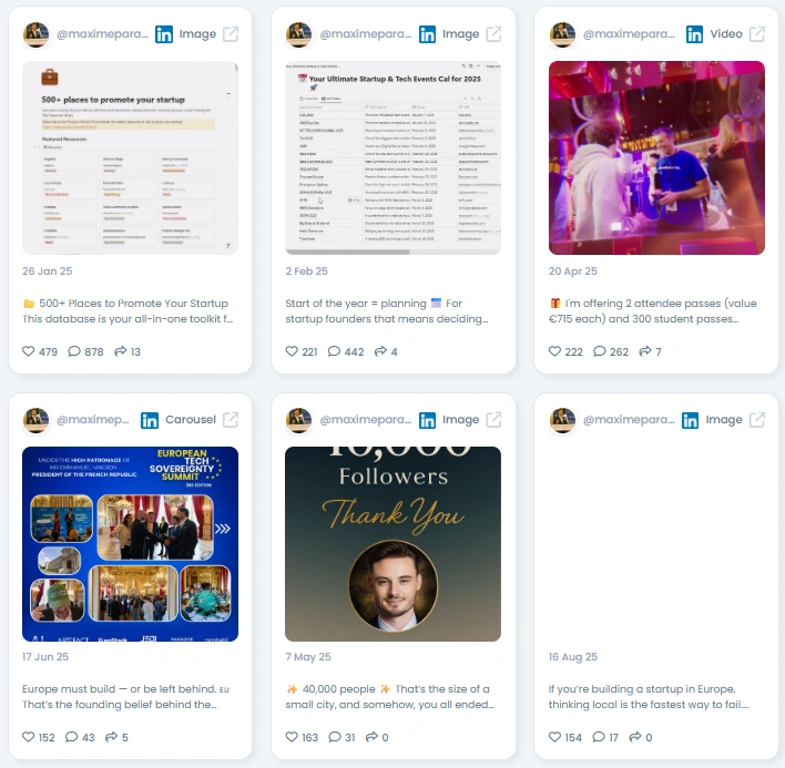 People listen because Maxime gives value first. His posts are practical, resource-driven, and founder-oriented. He shares templates, event lists, opportunities, and actionable advice that startup teams can use immediately. His tone is warm, straightforward, and optimistic, which makes the learning experience feel friendly rather than overwhelming. He brings clarity to a space that often feels chaotic.