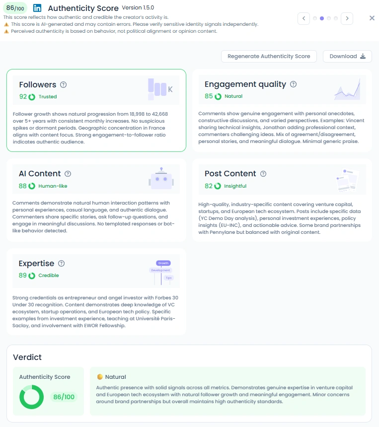 With a Favikon Authenticity Score of 86, Maxime shows a natural presence online. He shares personal moments, behind-the-scenes snapshots, and the challenges of building in Europe. His posts vary from curated resources to candid reflections on growth and failure. Comments on his content show real discussions with founders, VCs, and operators who appreciate his hands-on experience. He maintains a balance between professional polish and human openness.