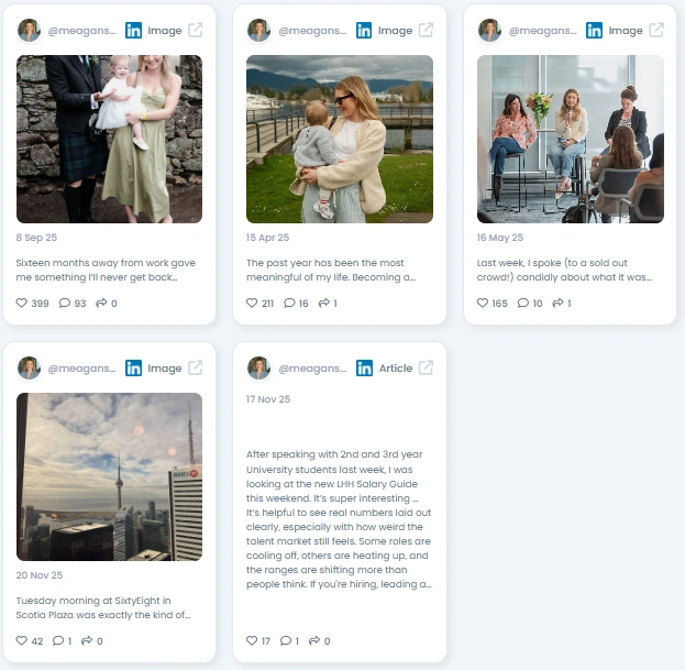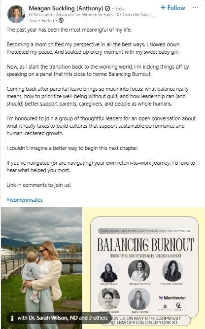 Meagan communicates with empathy and clarity. Her posts feel like thoughtful conversations about real challenges, not buzzwords or quick hacks. She shares personal stories, career reflections, and practical sales leadership insights. Her vulnerability never weakens the message, it strengthens it. People stay engaged because her content feels human, relatable, and genuinely helpful.