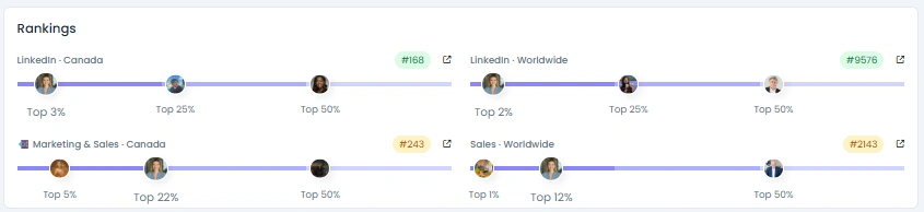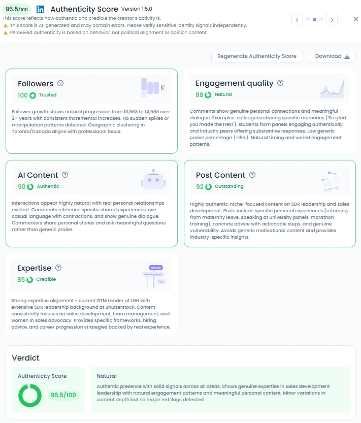 Meagan grew her audience from about 13,553 to 14,553 over two years with steady, healthy progression. Engagement quality is solid at 88, supported by personal comments from colleagues, students, and industry peers. Her post content score of 92 highlights her strong niche in SDR leadership and women in sales. She holds an influence score of 4,531 points and ranks in the top tier across LinkedIn Canada and the global sales community.