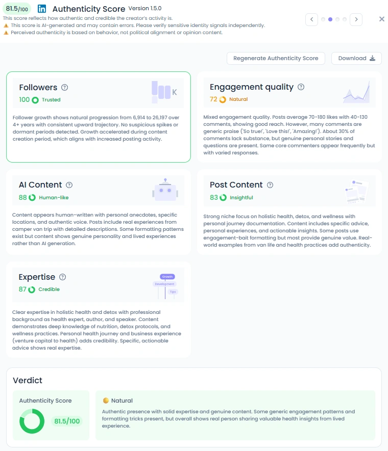 Favikon puts her Authenticity Score at 81.5 out of 100. Posts show real locations, specific routines, and unfiltered reflections from a solo van trip to national park hikes. She mixes education with personal snapshots and keeps the sales pitch light. The result is a voice that feels approachable and accountable.