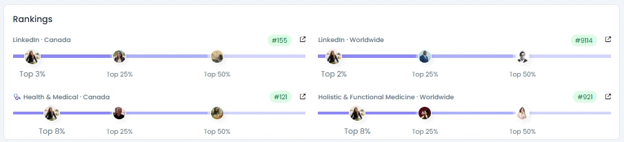 Her audience grew from about 6.9K to 26.2K over four-plus years, tracking steady creation cycles. Influence Score sits around 7,433 pts with engagement that trends natural and conversation-led. Rankings place her in the top 3% on LinkedIn in Canada and top 8% across Health and Medical in Canada. Posting cadence is consistent, with images driving strong saves and replies.