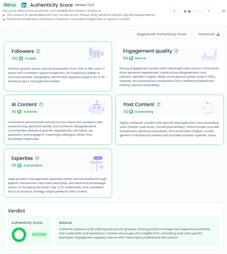 Favikon pegs her authenticity at 100/100. Comments show real debate and practitioner stories rather than empty praise. Posts include live shots from workshops, policy slides, and sketches of frameworks in progress. It feels like being invited behind the scenes of actual product work.