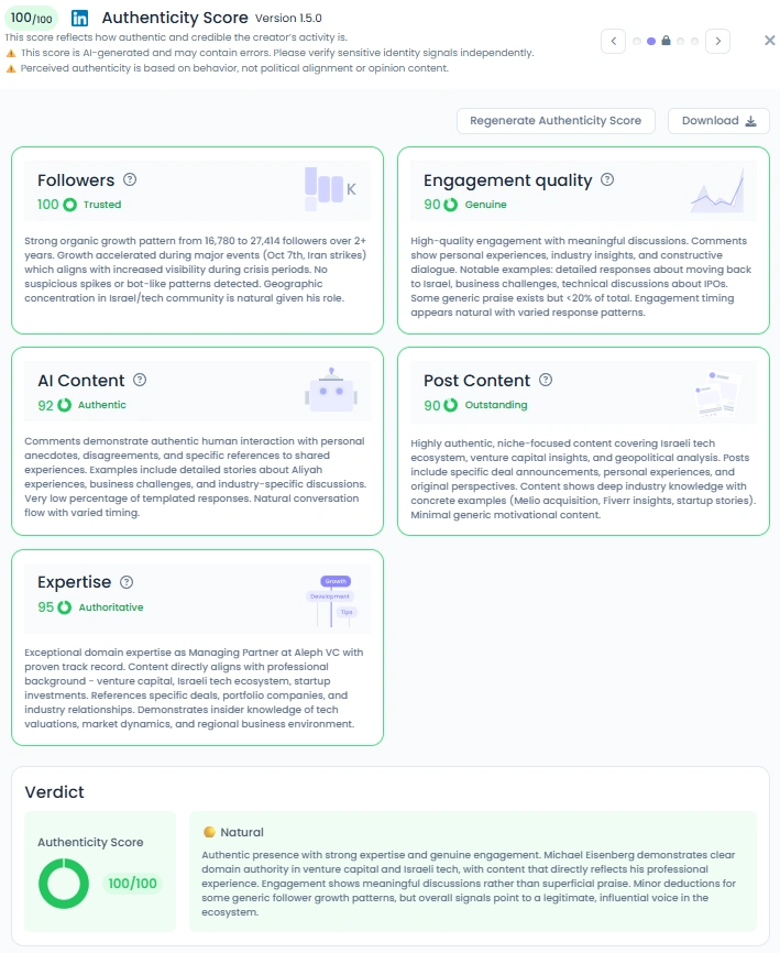 Michael holds a perfect 100/100 Authenticity Score, and it shows. His content is sharp, original, and deeply human. He does not rely on buzzwords or templated responses. Instead, he shares genuine thoughts, from detailed reflections on Aliyah and tech entrepreneurship to emotional posts about family, loss, and faith. His tone flows naturally between analytical and personal, showing that you can be both a serious investor and an accessible communicator. For Michael, authenticity is not a tactic, it is who he is.