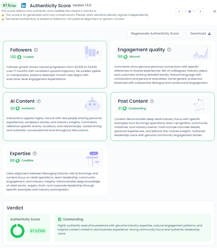 Favikon rates his authenticity at 97.5/100, and it shows. Comments are full of real colleagues and community partners. He mixes leadership notes with personal anecdotes and on-the-ground photos. Content about team recognition, store moments, and community events feels lived-in rather than scripted. Authority meets relatability.