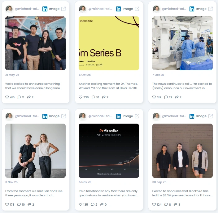 Michael Tolo is General Partner at Blackbird Ventures and an active investor in deep tech and health startups. He scouts and supports teams working on hard technical problems, from quantum adjacent tools to medical device innovation. His background mixes startup experience, technical literacy, and venture practice, which helps him back founders at scale. Michael often posts about investments, founder stories, and the operational lessons behind fast scaling. That mix of technical respect and practical support positions him as a trusted VC voice in Australia’s ecosystem.