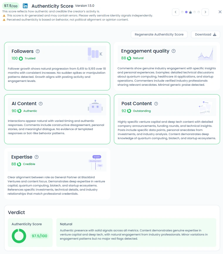 Favikon gives Michael a 97.5/100 Authenticity Score, reflecting a natural content mix and genuine engagement. His timeline shows real investment announcements, founder photos, and event recaps rather than marketing fluff. Comments come from industry peers and technical experts who add substantive perspectives. That pattern of transparent activity builds credibility with both founders and fellow investors.
