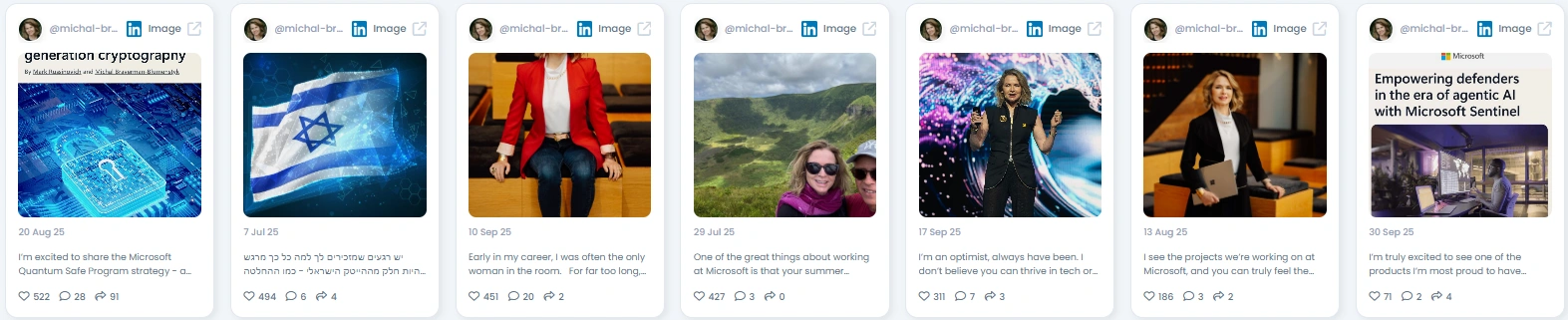 Michal Braverman-Blumenstyk leads security at Microsoft and shows up online like a modern CTO should: clear, calm, and hands-on. She talks quantum-safe cryptography one day and career lessons the next. Posts mix product news, human stories, and quick leadership notes in English and Hebrew. You come for the security insights and stay for the energy.