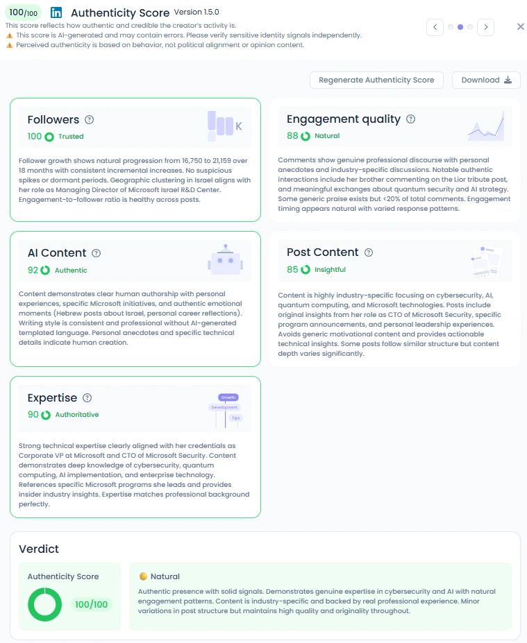 Favikon Authenticity Score: 100/100. Her feed reads human: Hebrew posts about Israel, photos from field trips, and proud team moments. Comments turn into real conversations about security trade-offs, not drive-by praise. It’s expert content with a personal voice.