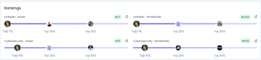 Follower base grew from 16.7K to 21.1K in 18 months with a smooth, organic curve. Engagement quality sits at 88/100 with steady dialogue across posts. Content quality scores 85/100 and Expertise 90/100. Influence Score clocks 5,712 pts, with rankings in the top 1% on LinkedIn Israel and top 6% in Israeli cybersecurity.