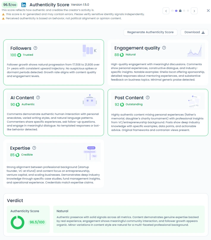 Favikon scores him 96.5/100 for authenticity and the score fits. His content shows clear authorship with personal anecdotes, event photos, and candid video clips. He posts speeches, founder spotlights, and real-world examples rather than canned PR. The result is high trust and sustained community engagement.