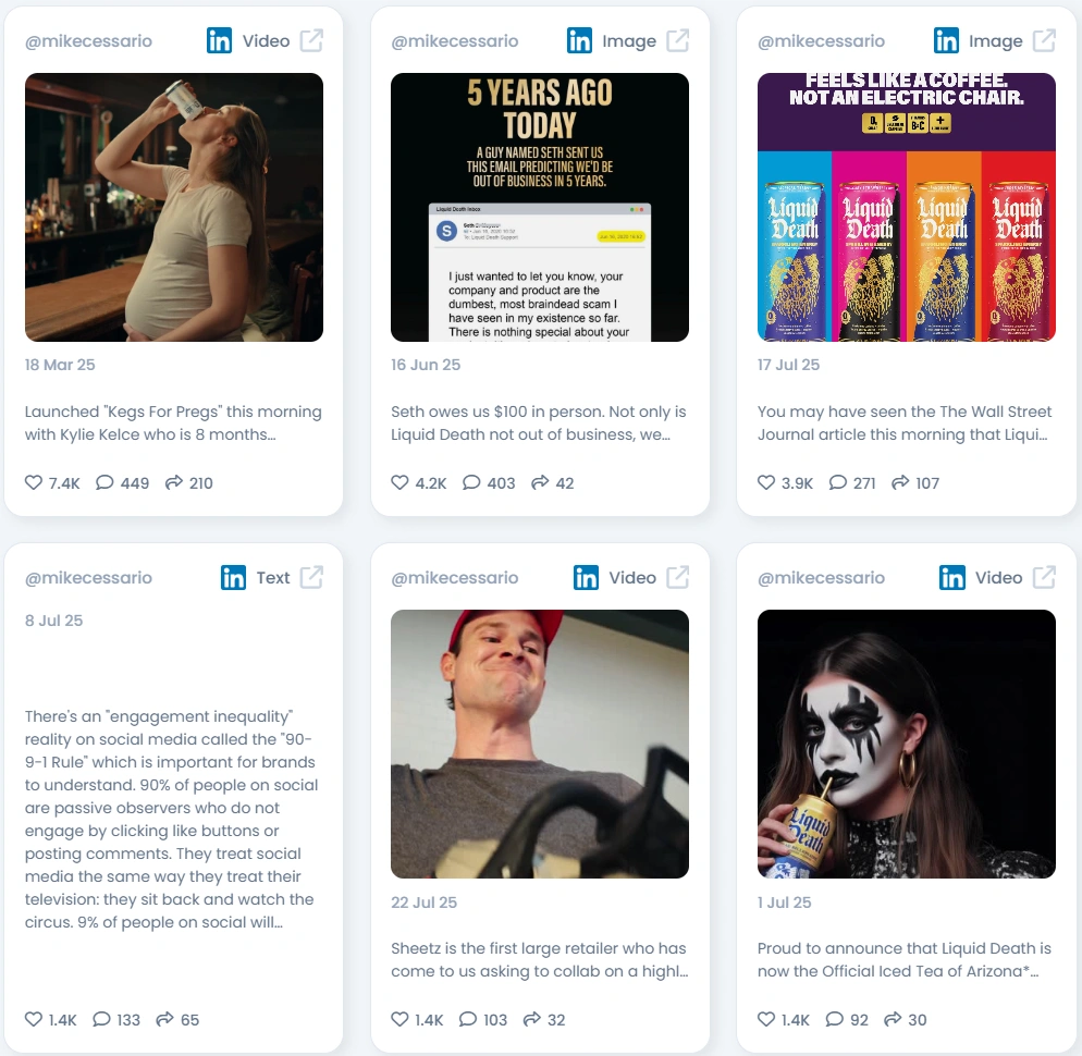 Mike Cessario is the CEO and founder of Liquid Death. He came up through creative and brand strategy, then used that edge to flip a sleepy category into pop culture. He scaled a metal-aesthetic water company into a multi-flavor platform with viral campaigns and celebrity collabs. His posts show how stunts connect to real business numbers and retail wins. He positions himself as a creative founder who measures everything while keeping the joke funny.
