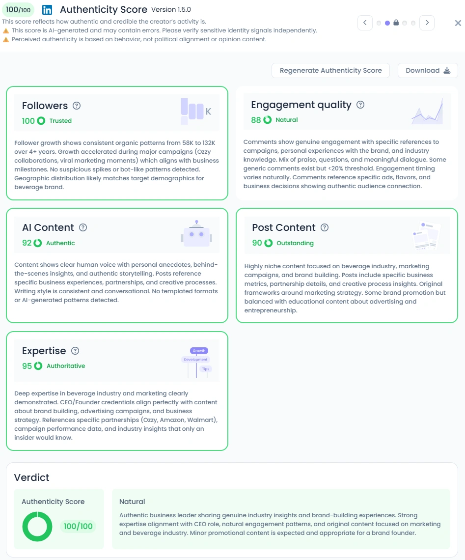 Favikon rates his presence 100/100. Growth from 58K to 132.2K LinkedIn followers over four years maps to real milestones like celebrity partnerships and viral moments. Comments include specific references to campaigns, flavors, retailers, and results. Writing is conversational and first person, with insider details that only a founder would know.
