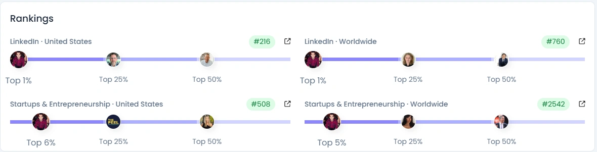 He sits at 132.2K on LinkedIn and 3.6K on X. Influence score is 7,540 pts with activity around 2 posts per month. Engagement quality is 88 and the profile ranks Top 1% on LinkedIn in the United States (#216) and Top 1% worldwide (#760). In Startups and Entrepreneurship he ranks Top 6% in the US (#508) and Top 5% worldwide (#2542), with steady +1.16% growth.