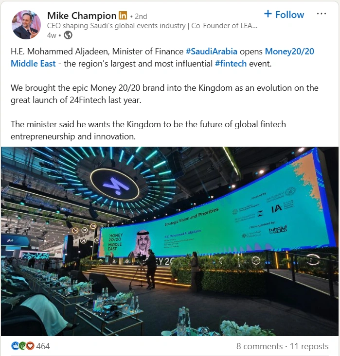 Mike Champion doesn’t just organize events. He builds ecosystems where ideas become movements. As CEO of Tahaluf and Co-Creator of LEAP and Cityscape Global, he has helped shape some of the most ambitious gatherings in the Middle East’s technology and business landscape. His posts bring together innovation, leadership, and collaboration, capturing what it truly means to build something that inspires nations.