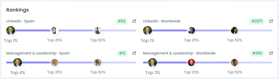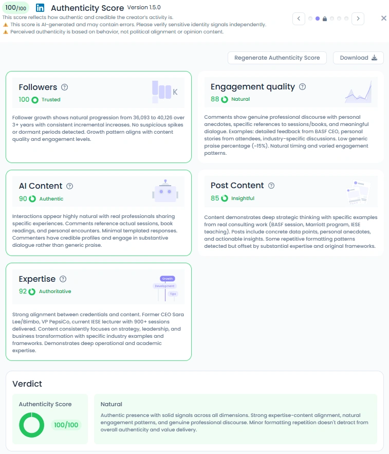 Miquel’s audience has grown steadily from 36,093 to 40,126 followers over three years with consistent engagement. His Influence Score of 7,041 points places him in the top tier for leadership and education creators worldwide. He maintains strong interaction on his posts, often gathering hundreds of likes from executives and professionals. His engagement quality sits at 88 Natural, reflecting healthy discussion, real professional feedback, and zero suspicious patterns.