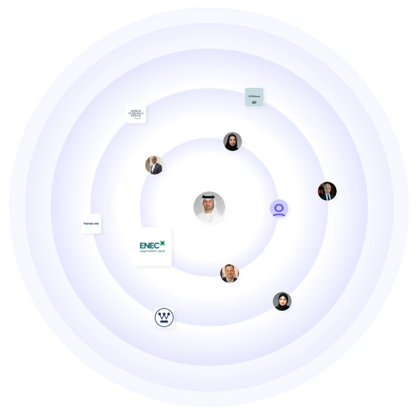 Mohamed moves within a circle that includes global energy institutions, nuclear experts, and senior government leaders. His network features the World Economic Forum, international reactor technology partners, regional utility executives, diplomats, and energy policymakers. ENEC’s brand sits at the center, surrounded by major organizations shaping the global clean energy transition. This network signals trust, authority, and deep alignment with international standards.