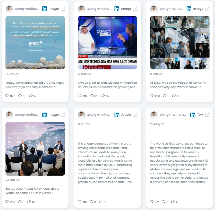 Mohamed is a vocal supporter of climate action, women in science, and the responsible use of advanced technology. His posts highlight the role of nuclear energy in reducing emissions and stabilizing long-term energy supply. He celebrates women scientists at ENEC and amplifies their contributions across STEM fields. He also engages in conversations about tech for good, especially where innovation meets public benefit. His advocacy blends national goals with global sustainability priorities.