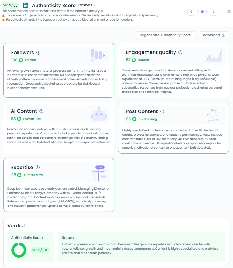 With a strong Authenticity Score of 97.5, Mohamed balances professionalism with transparency. His posts often feature real project images, public interviews, on-site panels, and high-level discussions at events such as Davos. Comments show technical insights from peers, personal anecdotes from industry professionals, and specific references to shared work experiences. He writes in both English and Arabic, reflecting the region’s natural voice and broadening accessibility.