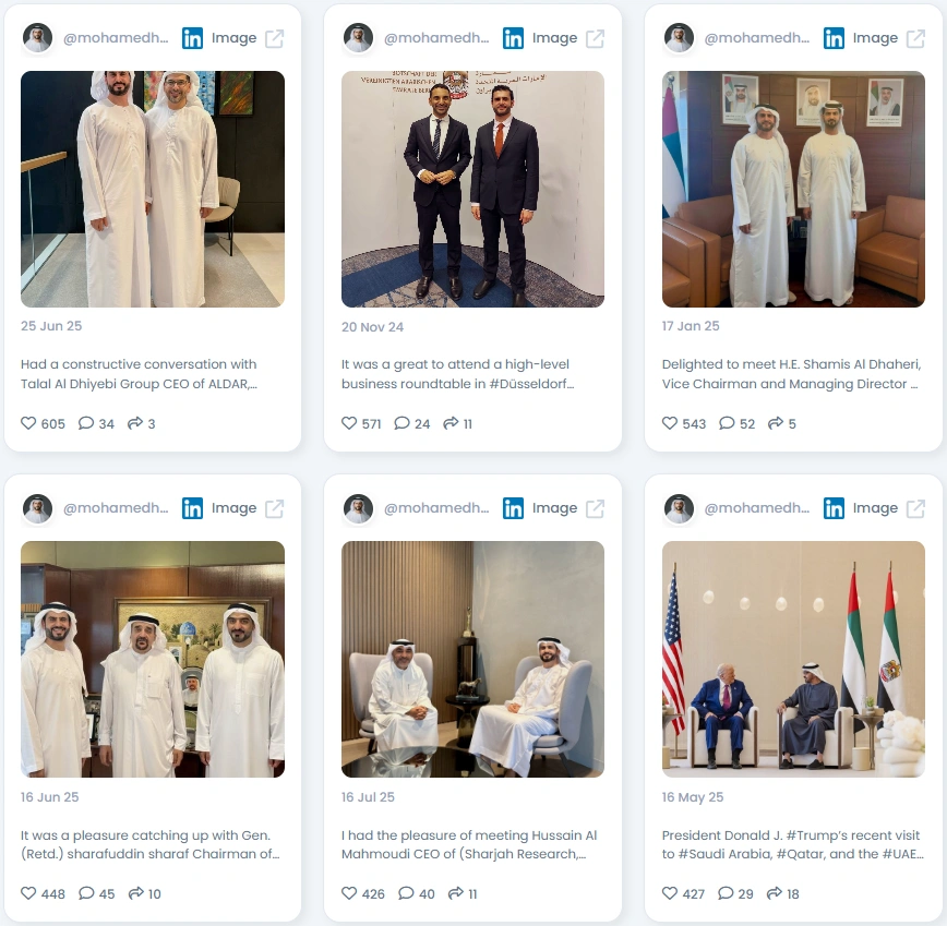 Mohamed’s network is a clear reflection of his stature in global finance and policy. He regularly connects with top-tier sovereign wealth funds and government-linked entities like ADIA, Mubadala, ADNOC, and ADQ. His engagement also extends to major international institutions such as the IMF and global tech giants including NVIDIA, Microsoft, and Salesforce. His feed is filled with images of him meeting global figures, from presidential-level delegates like Donald J. Trump to regional CEOs and influential UAE government officials, highlighting his direct access to the decision-makers shaping the economic landscape.