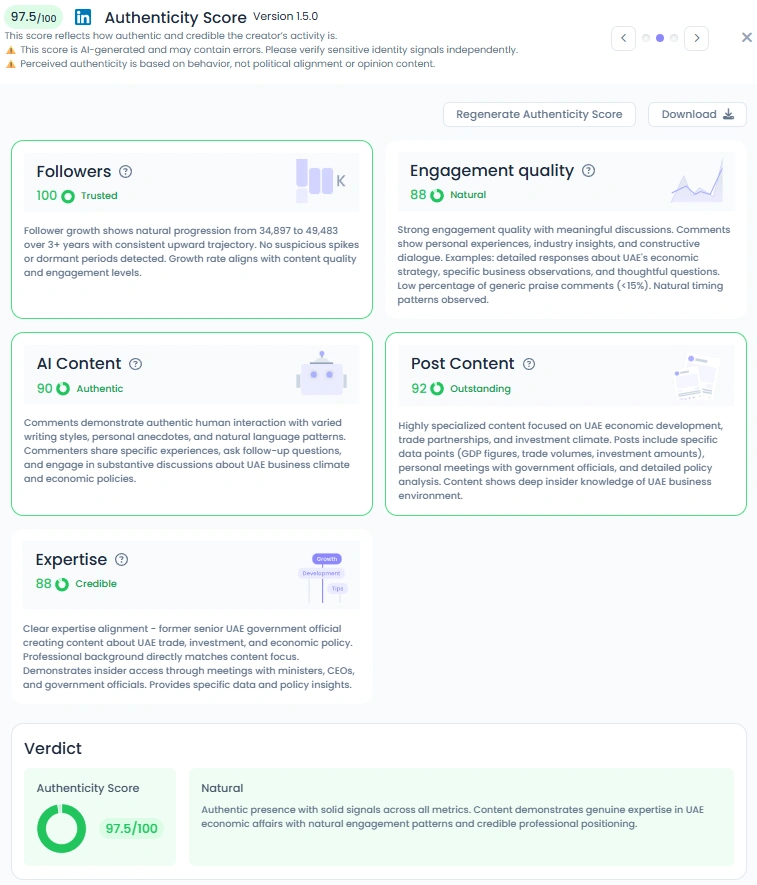Achieving a 97.5/100 Authenticity Score and a "Natural" verdict speaks volumes about how Mohamed has navigated the authority/relatability balance. His posts demonstrate authentic human interaction, scoring 90 for AI Content, by consistently integrating varied writing styles and personal anecdotes alongside his professional analysis. Furthermore, his Engagement Quality score of 88 is "Natural," driven by strong engagement with thoughtful questions and deep, constructive dialogue, with less than 15% of the comments being generic praise. He fosters a professional community where substance and genuine connection prevail.