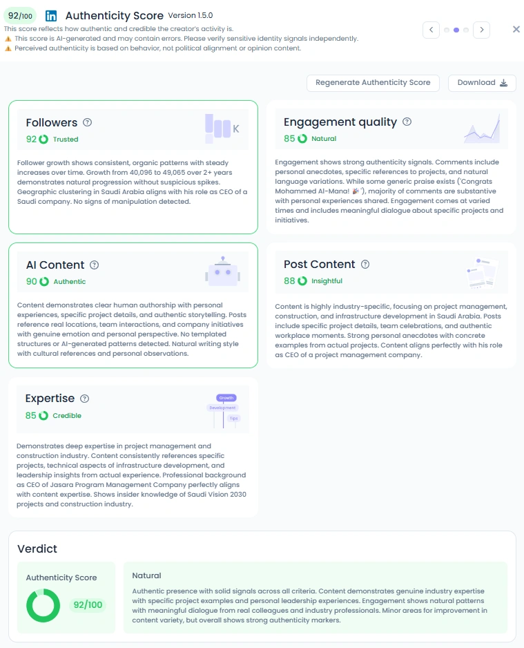 With an Authenticity Score of 92/100, Mohammed’s presence is genuine and grounded in experience. His AI Content score of 90 (Authentic) and Post Content score of 88 (Insightful) show a clear personal voice. His posts feature real workplace moments, team photos, and first-hand reflections rather than templated statements. Each update tells a story of progress and gratitude, building trust within Saudi Arabia’s professional community. His tone remains warm, humble, and deeply aligned with his values of collaboration and national service.