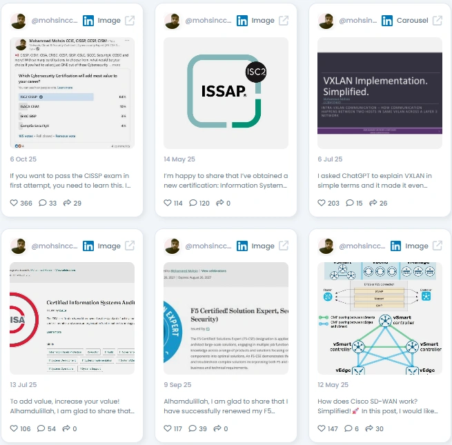 Mohammed creates educational carousels on VXLAN and SD-WAN that teams reuse in workshops. He partners with certification communities like ISACA and ISC2 for study dialogues. His F5 and Palo Alto tooling content helps practitioners validate designs. Media and meetup appearances focus on architecture choices that reduce risk and cost.
