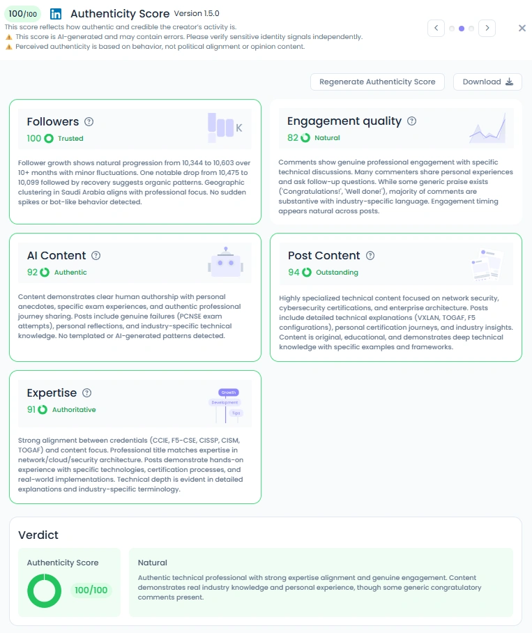 Authenticity Score sits at 100 out of 100. AI Content is 92 Authentic. Post Content is 94 Outstanding. Expertise is 91 Authoritative. His timeline includes personal exam stories, renewed certs, and architecture breakdowns. No templated voice. Real study paths. Real configs. Real impact.