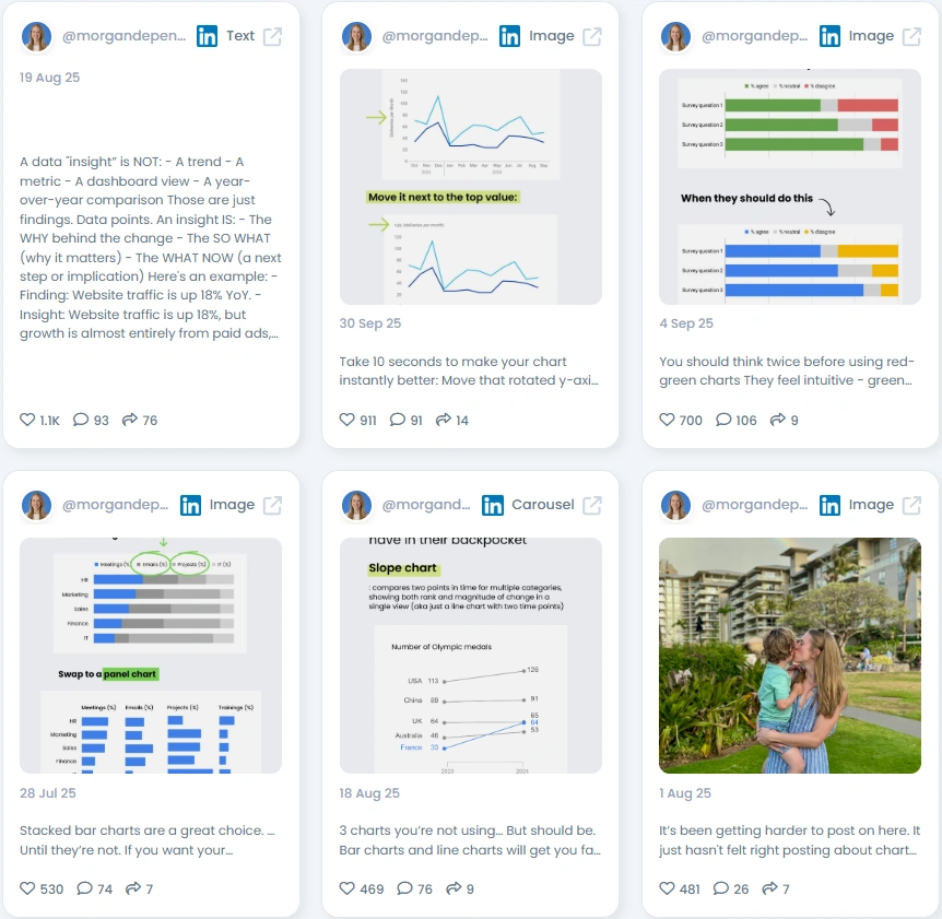 Morgan makes analytics feel human. She teaches people to show the “so what,” not just the numbers. Her posts are short, sharp, and practical, with chart fixes you can apply in minutes. If you care about data storytelling, she is a must-follow voice on LinkedIn.