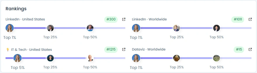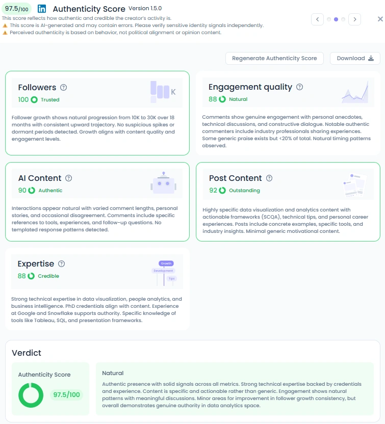 On LinkedIn she reaches roughly 30k followers with steady growth at +5.93%. She posts frequently at about 22 posts per month, with good engagement quality and very safe brand safety. Influence sits at 7,222 pts, and she ranks Top 1% on LinkedIn in the US and worldwide, and #15 worldwide in Dataviz. Estimated campaign value is around $780 per post.