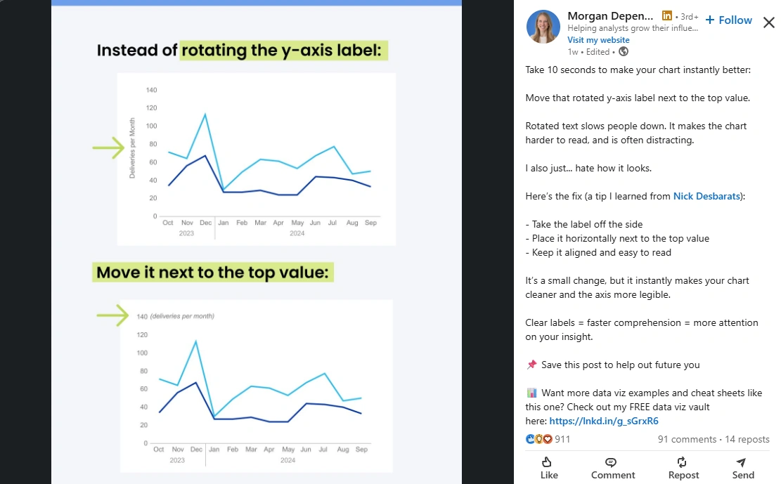 She teaches by doing. Posts show quick wins like moving a y-axis, swapping to a panel chart, or using slope charts to compare change over time. Her tone is upbeat and accessible. She explains the why behind each choice, so followers learn principles they can reuse, not just one-off tricks.