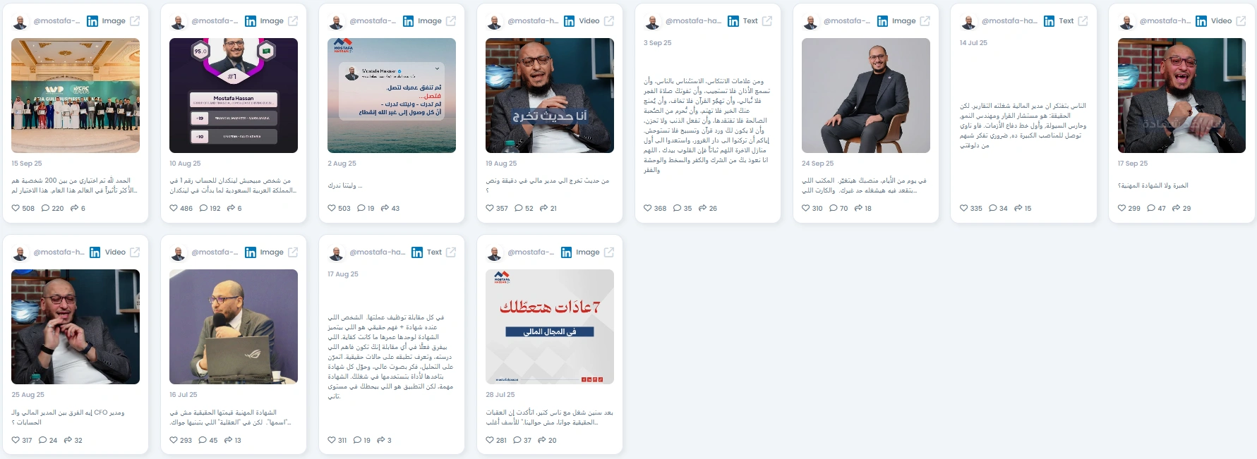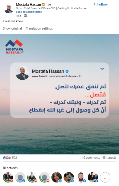 Mostafa Hassan is a Group CFO and financial consultant based in Saudi Arabia. He translates high-level finance into clear steps for leaders and young professionals. His posts mix boardroom lessons, Arabic explainers, and straight talk about careers. If you want practical finance and leadership, Mostafa delivers.